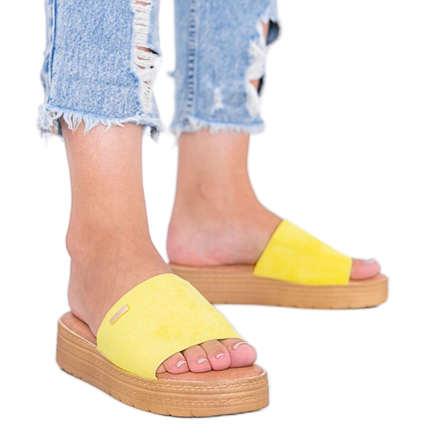 Gruba, 3,5-centymetrowa podeszwa to HIT tego sezonu, który zapewnia stabilność i wygodę podczas długich spacerów. Wykonana z zamszowej skóry ekologicznej cholewka w pięknym żółtym kolorze nadaje klapkom wyjątkowego charakteru i sprawia, że idealnie wpasowują się w casualowe stylizacje.