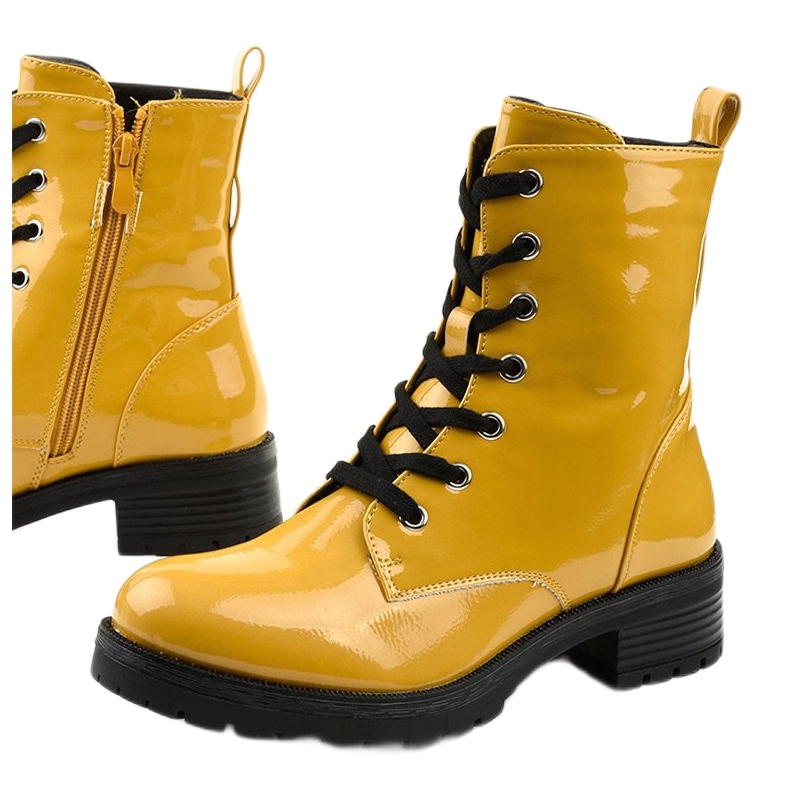 Nie czekaj, dodaj do swojej kolekcji te wyjątkowe żółte lakierowane glany, które z pewnością podkreślą Twój indywidualny styl!